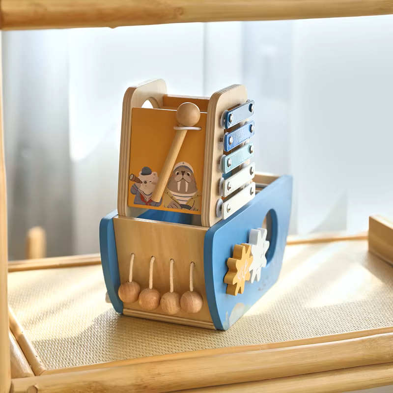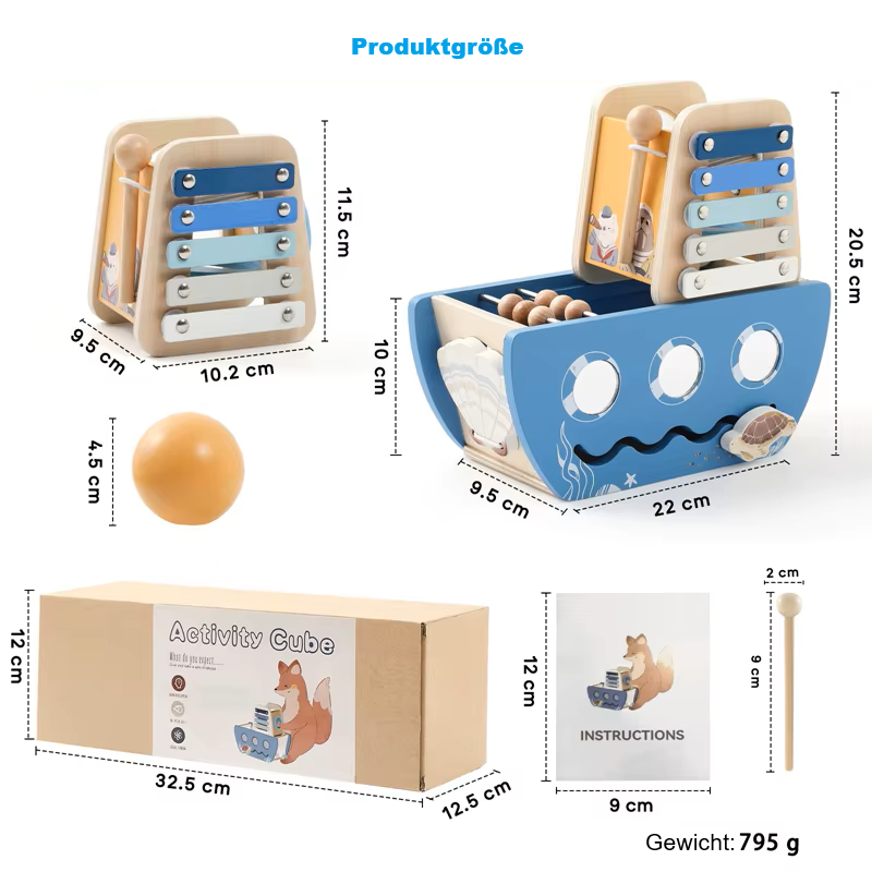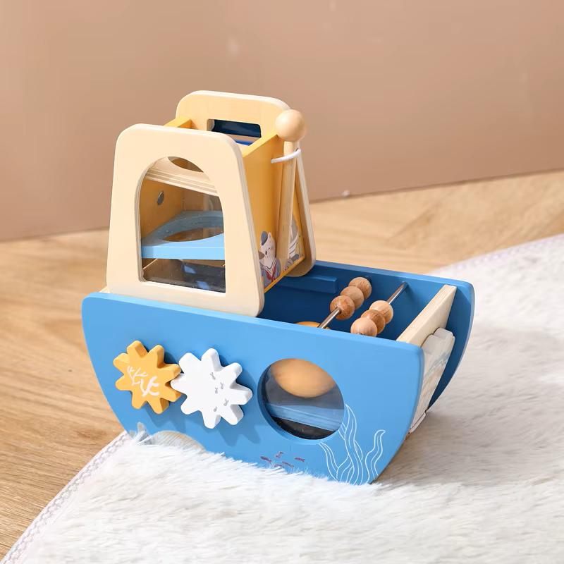 Das Montessori-Schiffs-Aktivitätsspielzeug ist aus hochwertigem, nachhaltigem Holz gefertigt und überzeugt durch eine sorgfältige Verarbeitung. Das farbenfrohe Design in Blau und Weiß zieht die Aufmerksamkeit der Kleinen an, während die Vielzahl an Aktivitäten das Entdecken und Lernen fördert. Mit verschiedenen interaktiven Elementen wie einem Perlenlabyrinth, einer drehbaren Scheibe, einem Rollenmechanismus und verschiebbaren Figuren bietet dieses Spielzeug jede Menge Abwechslung. Jedes Detail wurde mit Liebe zum Design und mit Sicherheit im Blick entwickelt. Dank der robusten Konstruktion ist es besonders langlebig und sicher für die Kinderhände. Zudem ist es mit ungiftigen, umweltfreundlichen Farben verziert, die für Kinder unbedenklich sind.