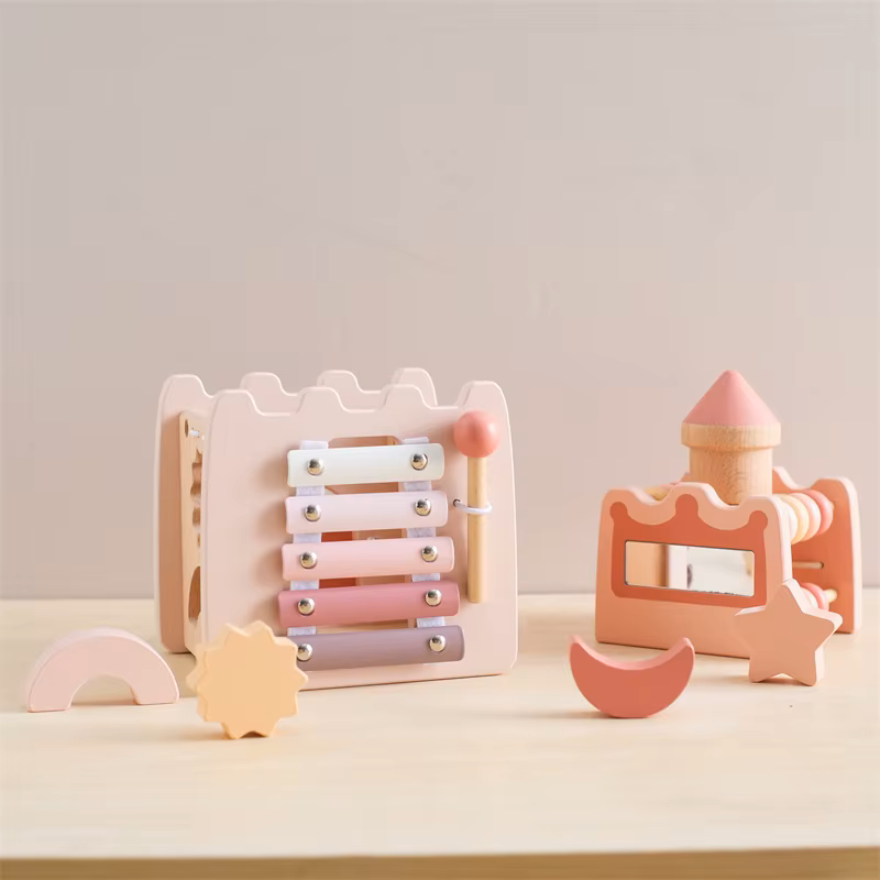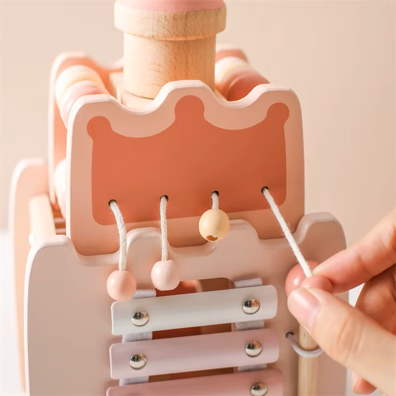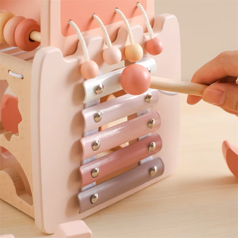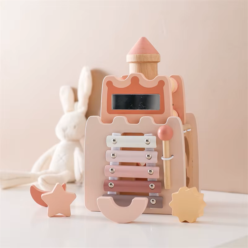 Dieses Montessori Holzspielzeug in Form eines bezaubernden Schlosses ist perfekt für kleine Entdecker. Hergestellt aus hochwertigem, nachhaltigem Holz, überzeugt es durch seine Langlebigkeit und kindgerechte Verarbeitung. Die verschiedenen Farben und Formen (Sterne, Monde, Zahnräder) fördern das Erkennen von Formen und Farben und bieten viele spielerische Möglichkeiten. Die beweglichen Teile, wie die Perlenrollen und das Xylophon, ermöglichen es den Kindern, ihre Feinmotorik weiterzuentwickeln, während sie gleichzeitig ihre akustischen Sinne schulen. Der angenehme Klang der Holzstäbe und das kindgerechte Design machen dieses Spielzeug zu einem wahren Highlight im Kinderzimmer.