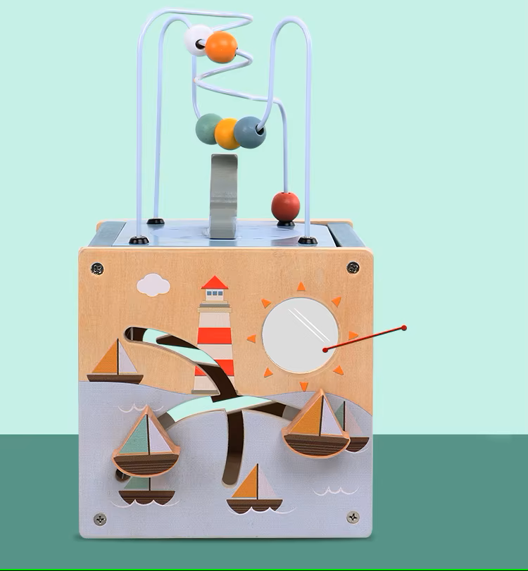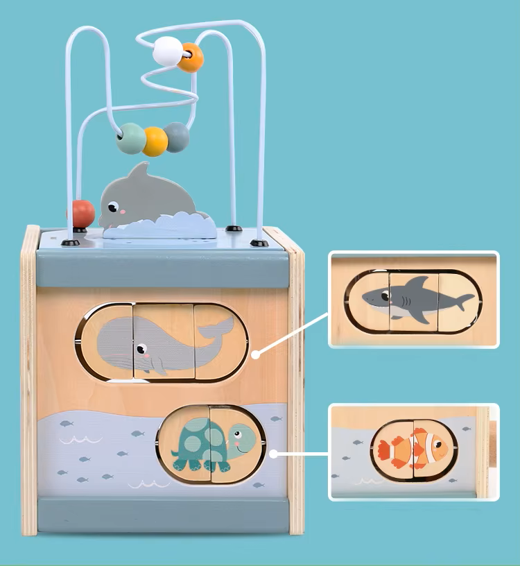 Unser 5-in-1 Aktivitätswürfel aus Holz für bietet ihrem Kind zahlreiche Lernmöglichkeiten. Er enthält fünf verschiedene Spielstationen: ein oberes Perlenlabyrinth, ein Formsortierer, ein Flip-Board-Puzzle mit niedlichen Meerestieren, ein verschiebbares Schiffslabyrinth und eine Rennperle. Jeder dieser Teile fördert die Feinmotorik, die Hand-Auge-Koordination und das Problemlösungsvermögen. Der Würfel ist aus hochwertigem, robustem Naturholz gefertigt und mit umweltfreundlichen, kindersicheren Farben verziert, die ihn nicht nur sicher, sondern auch optisch ansprechend machen. Besonders praktisch: Das Perlenlabyrinth lässt sich separat verwenden und kann zum einfachen Verstauen umgedreht werden. Die verschiedenen Spielelemente halten Ihr Kind auf unterhaltsame Weise beschäftigt und fördern dabei die Entwicklung wichtiger Fähigkeiten.