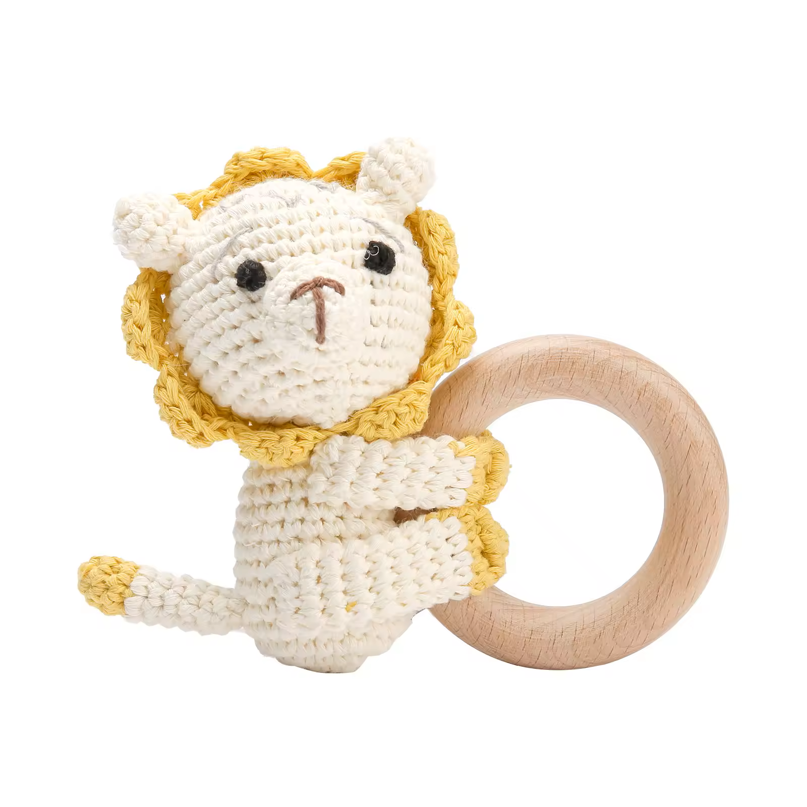 - Material: Holzring aus naturbelassenem, unbehandeltem Holz kombiniert mit hochwertigem Häkelgarn aus Baumwolle, Integrierte Rassel im Tierkopf